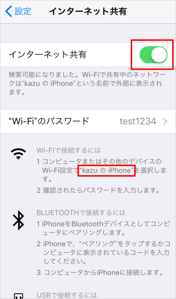 パスワードはiPhoneのインターネット共有設定画面に表示されています。